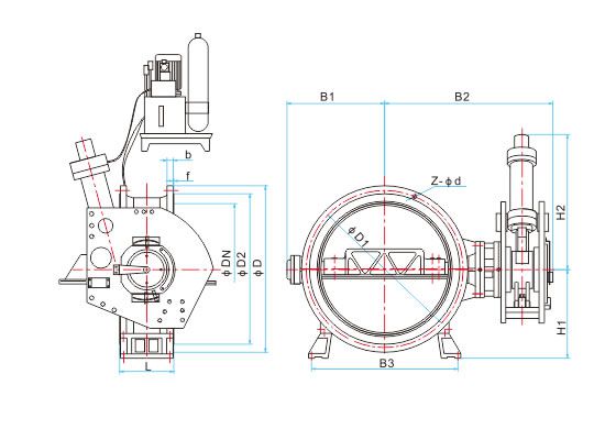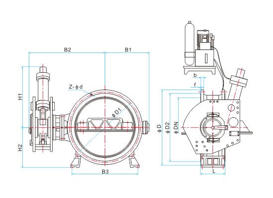 該蝶閥開啟、關閉均靠液壓驅動,可在 90 °范圍內(nèi)調(diào)節(jié)蝶板快、慢兩階段關閉角度,可立臥兩式安裝。